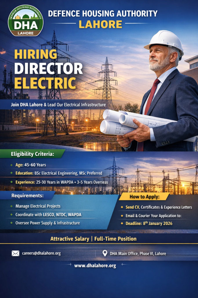 The Defence Housing Authority (DHA) Lahore, a prestigious and reputable organization, has announced a career opportunity for the position of Director Electric. The position is aimed at talented, qualified, and experienced professionals who possess the required expertise in electrical engineering, particularly in power systems. The ideal candidate will be responsible for overseeing all electrical matters related to the authority, including projects, ventures, and undertakings that pertain to DHA Lahore’s infrastructure. The role demands significant experience, with a minimum of 25-30 years in WAPDA and at least 3-5 years of overseas managerial experience in electrical roles. Interested applicants should hold a BSc in Electrical Engineering with a specialization in power, with a preference for those holding an MSc in the same field. The position is full-time, based in Lahore, and specifically targets male applicants within the age range of 45-60 years.