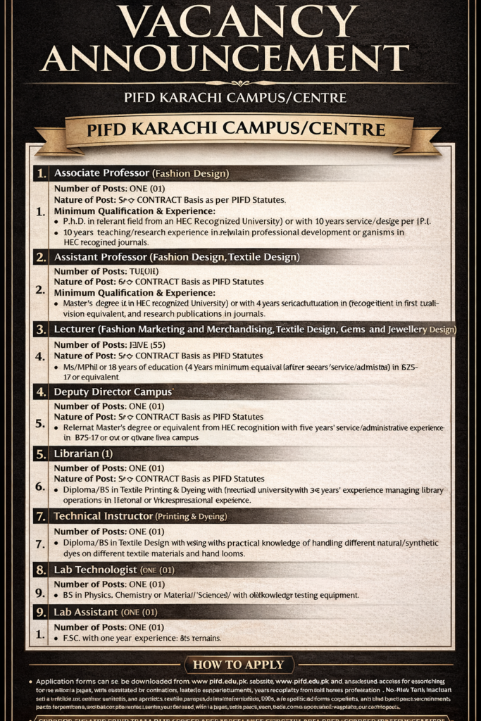The Pakistan Institute of Fashion and Design (PIFD), a chartered public-sector institute under the Government of Pakistan, has announced multiple job vacancies at its Karachi Campus/Centre for qualified and experienced professionals. The advertisement invites applications for a wide range of academic and non-academic positions, including Associate Professor, Assistant Professor, Lecturer, Director (Campus), Assistant Director, Technical Assistant (Dyeing & Printing), Technical Assistant (Weaving), Lab Assistant, and Attendant. These positions are offered purely on a contract basis as per PIFD statutes, with posts available across specialized fields such as Fashion Design, Textile Design, Fashion Marketing and Merchandising, Gems and Jewellery Design, and various technical and administrative support roles.